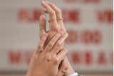Hoewel de kralen die we gebruiken gemaakt zijn van massief sterling zilver of onze vergulde sterling zilveren kralen een zeer dichte vergulding hebben van 1 micron (ter vergelijking: kostuumjuwelen zijn meestal 0,3 micron), raden we je aan de ring te verwijderen voor persoonlijke hygiëne om de natuurlijke schoonheid lang te behouden.